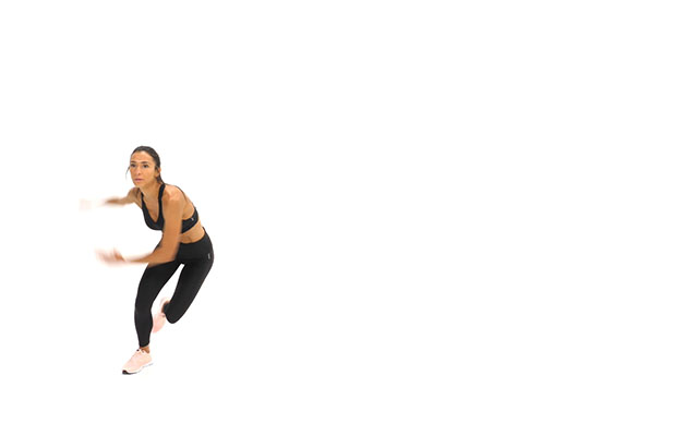 En lugar de sentadillas, ahora harás zancadas y el trabajo del patinador para aumentar el cardio ¡y quemar tantas calorías como sea posible!