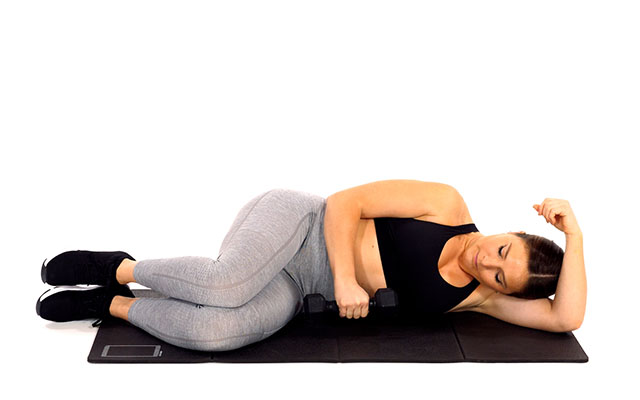 Vous aurez besoin de vous munir d'une paire d'haltères et d'un tapis.