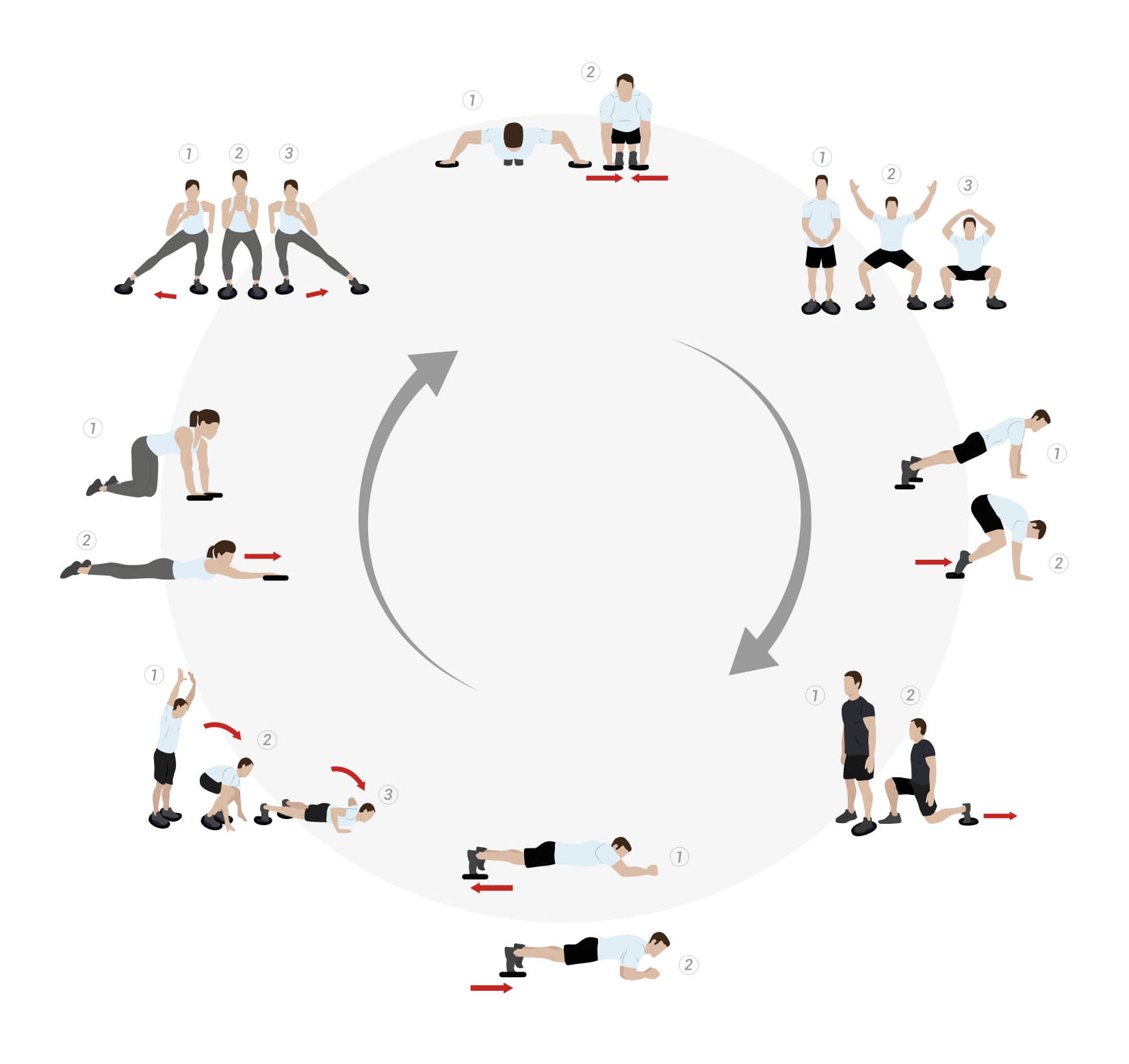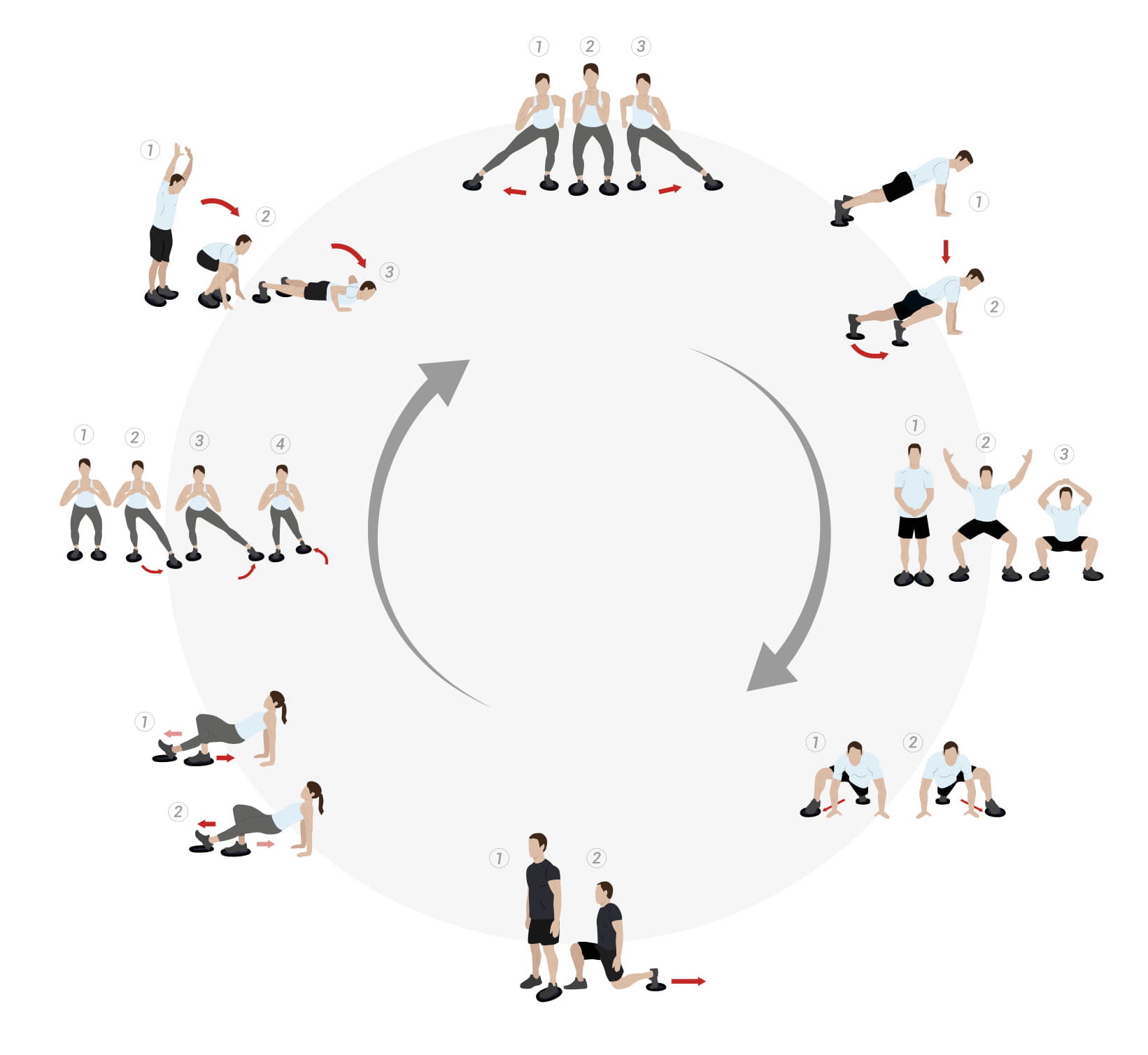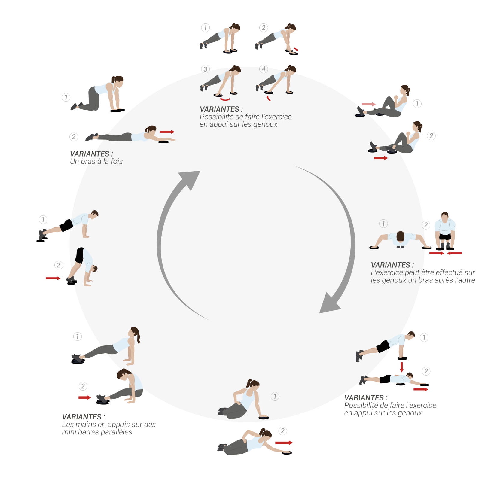 Après un échauffement de 4 exercices, vous allez enchainer les 8 exercices.