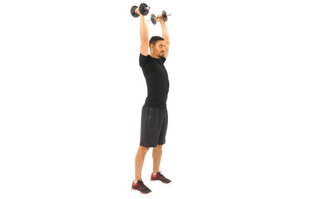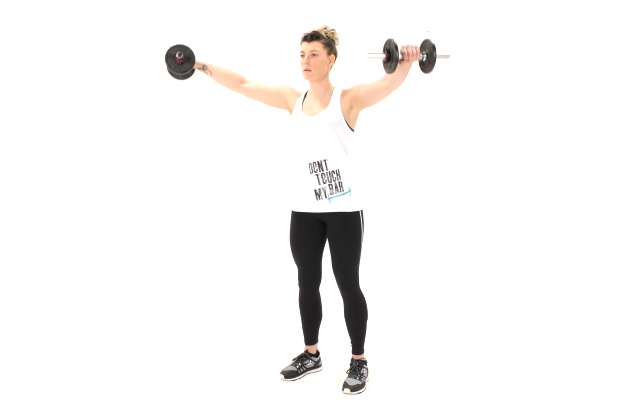Ti serviranno 2 manubri da 4 kg per le "shoulder press", 2 manubri da 5 Kg per l'esercizio "panca piana", un manubrio da 6 Kg per gli "squat" e 2 manubri da 2 Kg per i sollevamenti laterali.