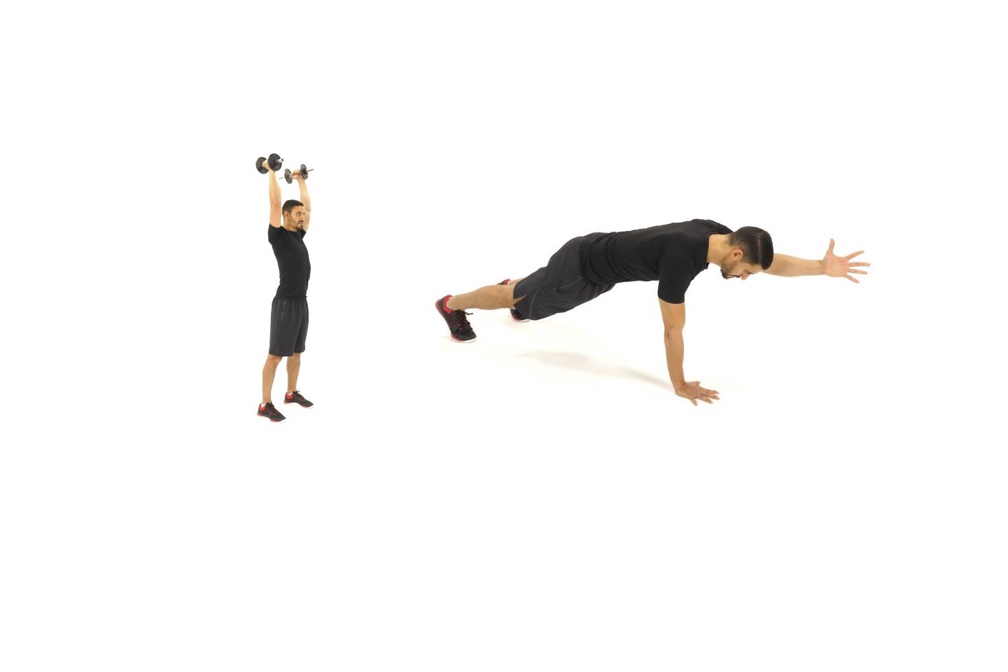 Ti serviranno 2 manubri da 5 Kg per la "panca piana", 2 manubri da 3 Kg per le "shoulder press in combinazione", 2 manubri da 2 Kg per i "sollevamenti laterali e frontali" e un manubrio da 8 Kg per gli "squat combinati".